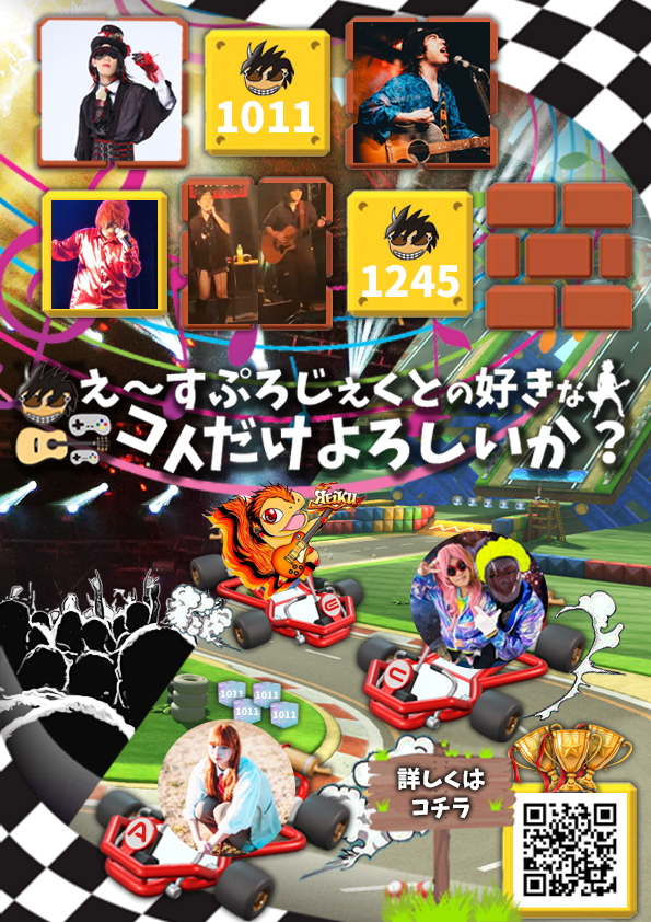 イベント 出演アーティスト 新着情報 お問い合わせ イベント 出演アーティスト 新着情報 お問い合わせ 2025年10月11日(土)江古田club Dorothyえ~すぷろじぇくと好きなコトだけよろしいか? vol.1 ■前半戦:音楽イベント■後半戦:みんなで「マリオカート8 デラックス」大会!皆様のご来場をお待ちしております! 新着情報News 2025.11.11 え~すぷろじぇくと好きなコトだけよろしいか vol.2開催! 2025.10.12 イベント無事終了いたしました。 2025.10.05 X(旧Twitter)開設しました 2025.10.01 イベントサイト作成 新着情報一覧 最新イベント情報Event 第2回イベント 2026年4月18日(土)江古田club Dorothyにて初めての企画イベントを実施しました 詳しくは、詳細ページをご覧ください。 第1回イベント 2025年10月11日(土)江古田club Dorothyにて初めての企画イベントを実施しました 詳しくは、詳細ページをご覧ください。 過去イベント一覧 出演アーティスト一覧Artist TRIO 埼玉 越谷発💨 スリーピースバンドTRIO‼️ ポップ・ロックを中心とした演奏をしています!! … 魂-ソウル- プロフィール/略歴:2015年より音楽活動開始。 都内のライブハウスを中心にしたステージや都内の大型公園の野外イベントに… アオサキダイキ 『自分を変える音楽と人の感情を動かす音楽を』/栃木県出身/TSMアーティスト&プロデューサーコース卒業/70&… ЯEiKU 歌と6弦と🍜屋店員/ソロ→ЯEiKU、バンド→SUNNY LOTUS アレアレ(くれい爺&ふぃ〜婆) Comming Soon The Kinicies 今年からライヴ活動を始めた歌詞で思いを伝える【Vo Yousuke】と曲で考えを届ける【Gt Yoshinori】で貴方… Hf-アッシュ- 古今東西ジャンル問わずに好きな音楽を世界に向けて唄って発信します。 MUSIC is MAGIC さぁ音のILLUSIO… ACEproject 関東を中心にライブ・路上ライブ活動・配信・ラジオパーソナリティーなどなど思いついた好きなコトだけを飽きるまで活動している… 出演アーティスト一覧 関連リンクlink