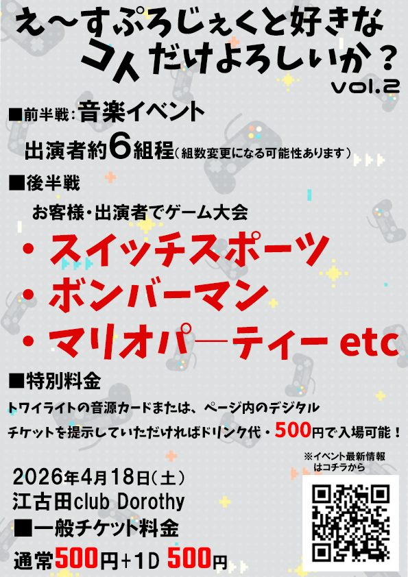 【特別料金】トワイライトの音源カードまたは、ページ内のデジタルチケットを提示していただければドリンク代・500円で入場可能!
