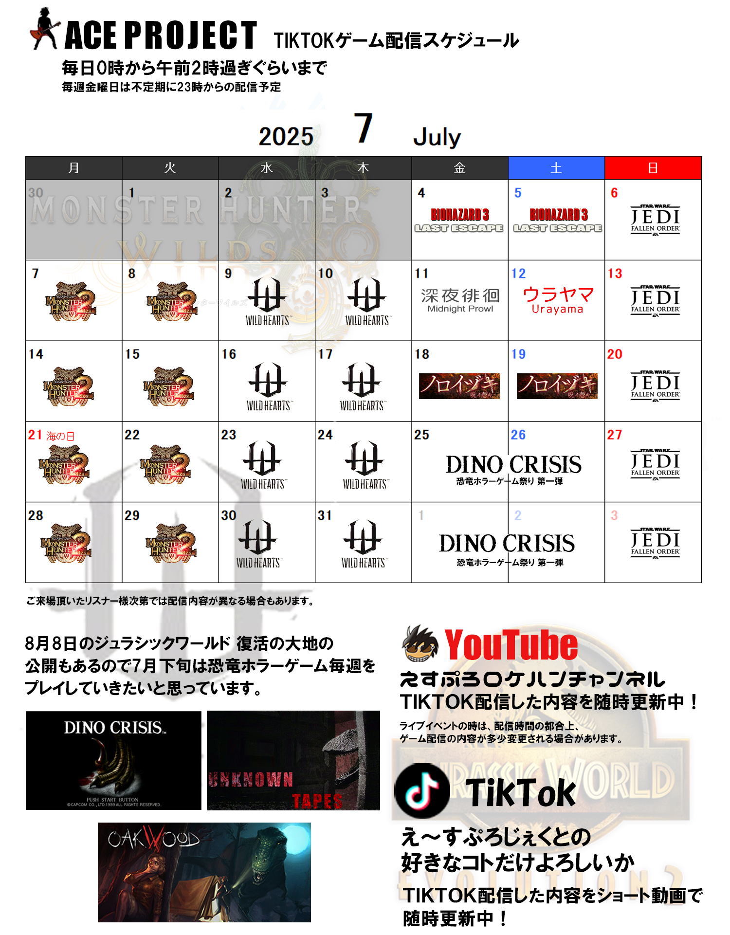 プレイしている詳しいゲームの概要は上記カレンダーを参照ください。